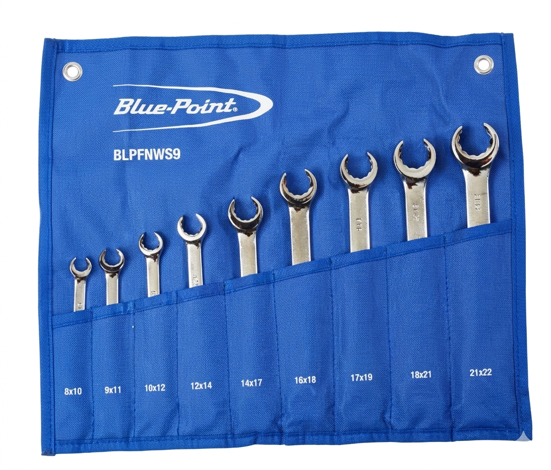 Blue Point Flare Nut Wrench Set BLPFNWS9 – 9-piece SAE and metric set with 6-point flare nut design, chrome vanadium steel construction, and storage roll for professional automotive and industrial use.