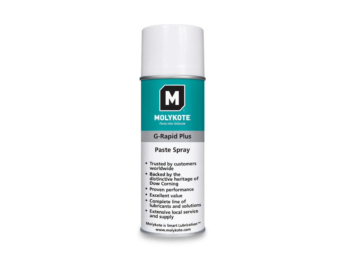 MOLYKOTE G-Rapid Plus Spray Black is a solid lubricant with mineral oil that is used as a permanent and running-in lubricant for machine components such as saws, drills, threaded spindles, screws, pumps, bearing, pulleys, and gears. It provides low friction, good coverage, high pressure absorption, and prevents stick-slip, scoring, seizure, and fretting corrosion